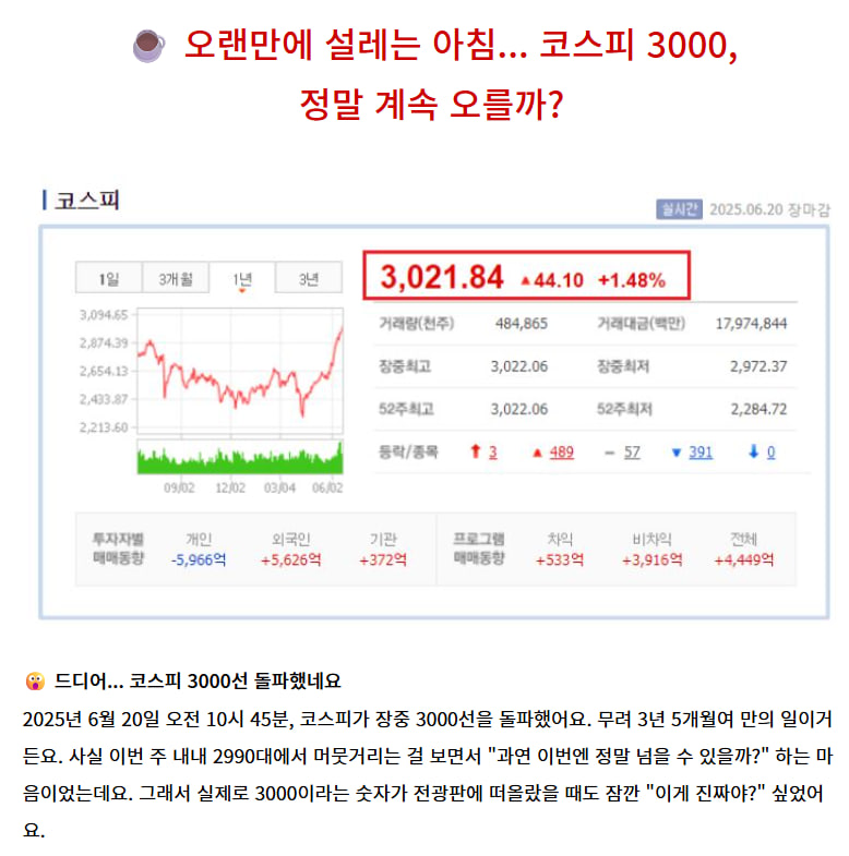 종가 기준으로는 4042.83을 기록하며 45년 만에 새로운 역사를 썼습니다. 이러한 상승은 반도체 산업의 호조, 정부의 자본시장 활성화 정책, 그리고 미국 증시의 안정 등 복합적인 요인에 의해 주도되었다.
