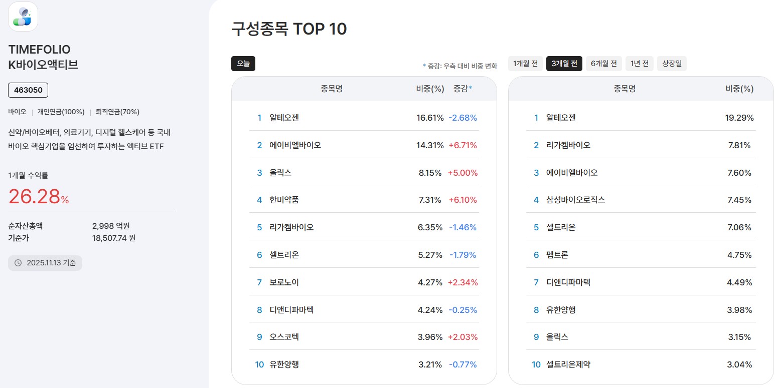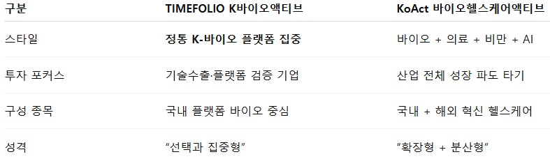 ETF 투자한다는 건, 종목을 맞히는 게임이 아니라 산업의 큰 방향을 사는 전략입니다. ✔ TIMEFOLIO K바이오액티브 = 정교하고 선별된 플랫폼 바이오 중심 ✔ KoAct 바이오헬스케어액티브 = 전체 헬스케어 성장 파도까지 포함하지만 핵심은 하나 ➡️ ‘산업이 살아나는 시점에 올라타야 한다’ |