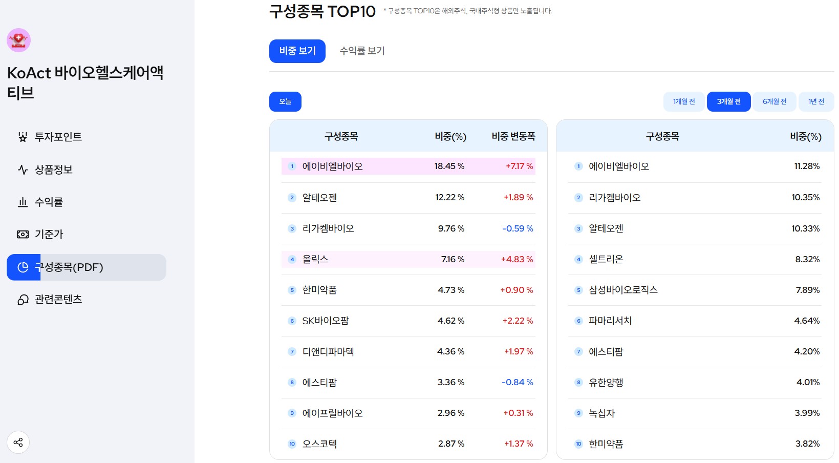 두 ETF 모두 K-바이오를 대표하는 알테오젠, 에이비엘바이오, 리가켐바이오, 올릭스 등을 핵심 종목으로 가져가기 때문에 종목 구성의 '유사성'이 높게 느껴집니다. 하지만, 특정 종목에 대한 비중 차이 (가장 두드러진 것은