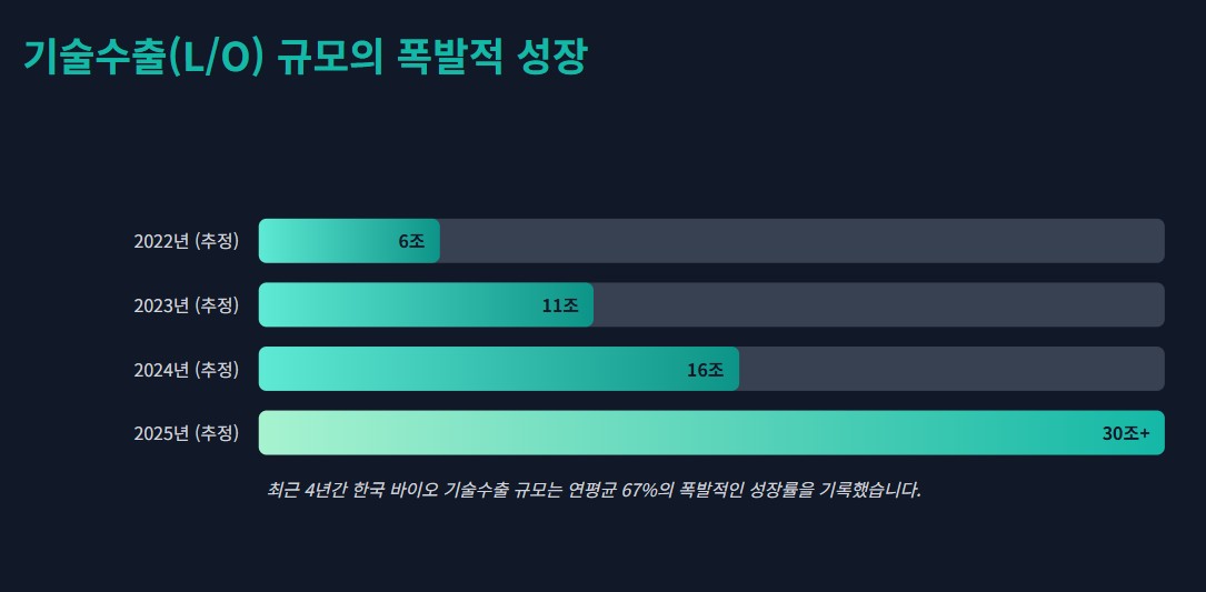② L/O(기술수출) 규모 성장률: 연평균 67% 폭발최근 4년간 한국 바이오 기술수출 규모는 👉 6조 → 11조 → 16조 → 30조 이상이는 단순 숫자 성장 이상입니다.