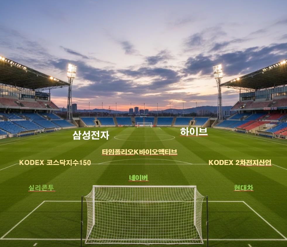 최전방(FW): 글로벌 반도체 리더인 삼성전자와 엔터테인먼트 대장주인 하이브가 강력한 화력으로 시장의 득점(수익)을 노립니다.